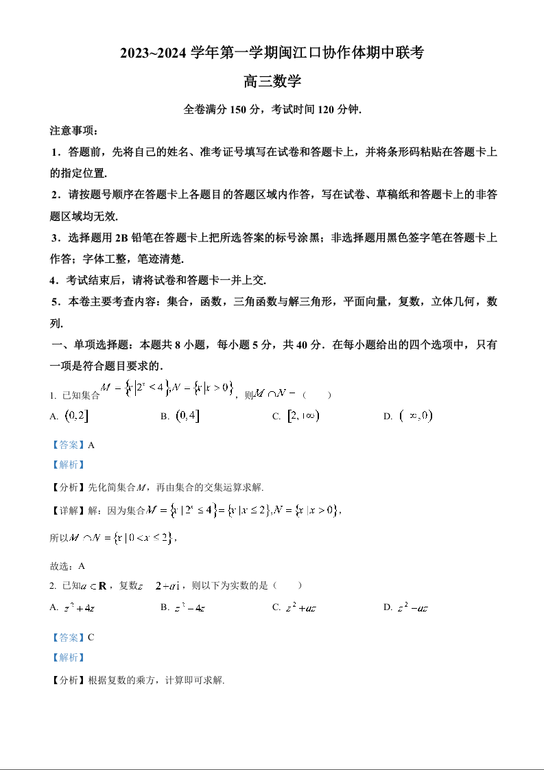 福建省福州市闽江口协作体2023-2024学年高三上学期11月期中联考 数学答案