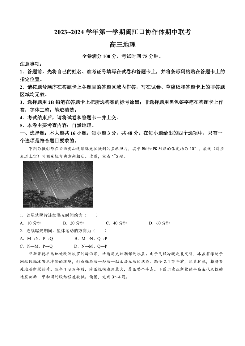 福建省福州市闽江口协作体2023-2024学年高三上学期11月期中联考 地理
