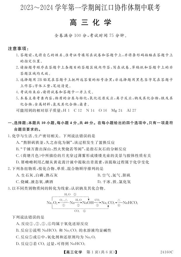 福建省福州市闽江口协作体2023-2024学年高三上学期11月期中联考 化学