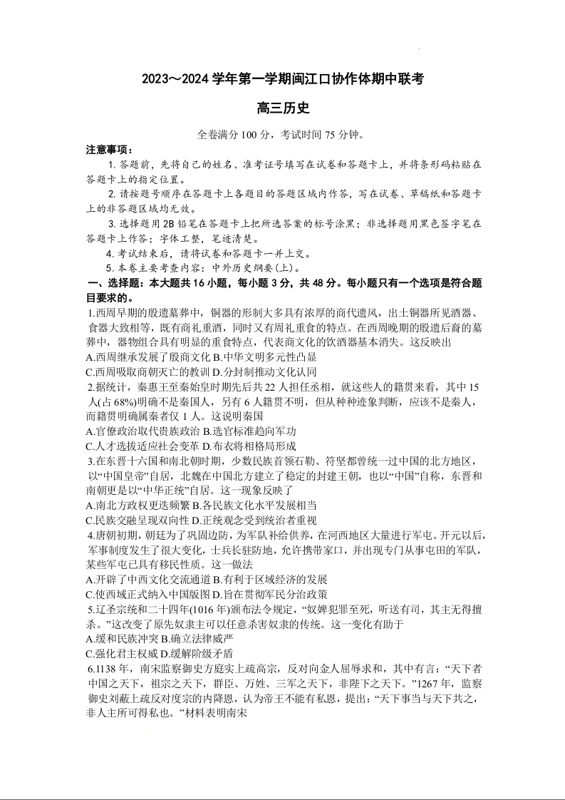 福建省福州市闽江口协作体2023-2024学年高三上学期11月期中联考 历史