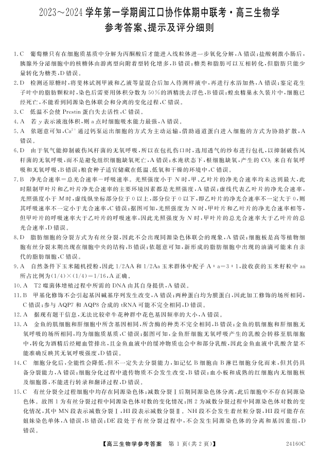 福建省福州市闽江口协作体2023-2024学年高三上学期11月期中联考 生物答案