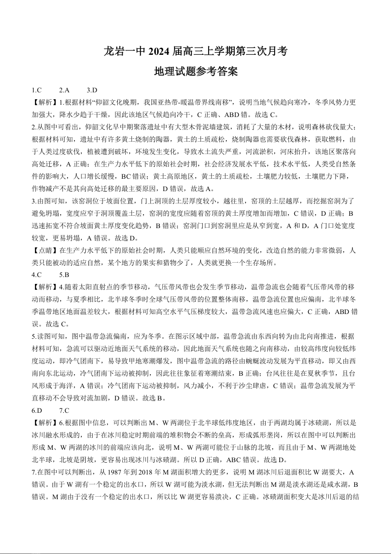 福建省龙岩第一中学2023-2024学年高三上学期第三次月考 地理答案