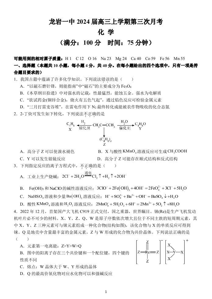 福建省龙岩第一中学2023-2024学年高三上学期第三次月考 化学