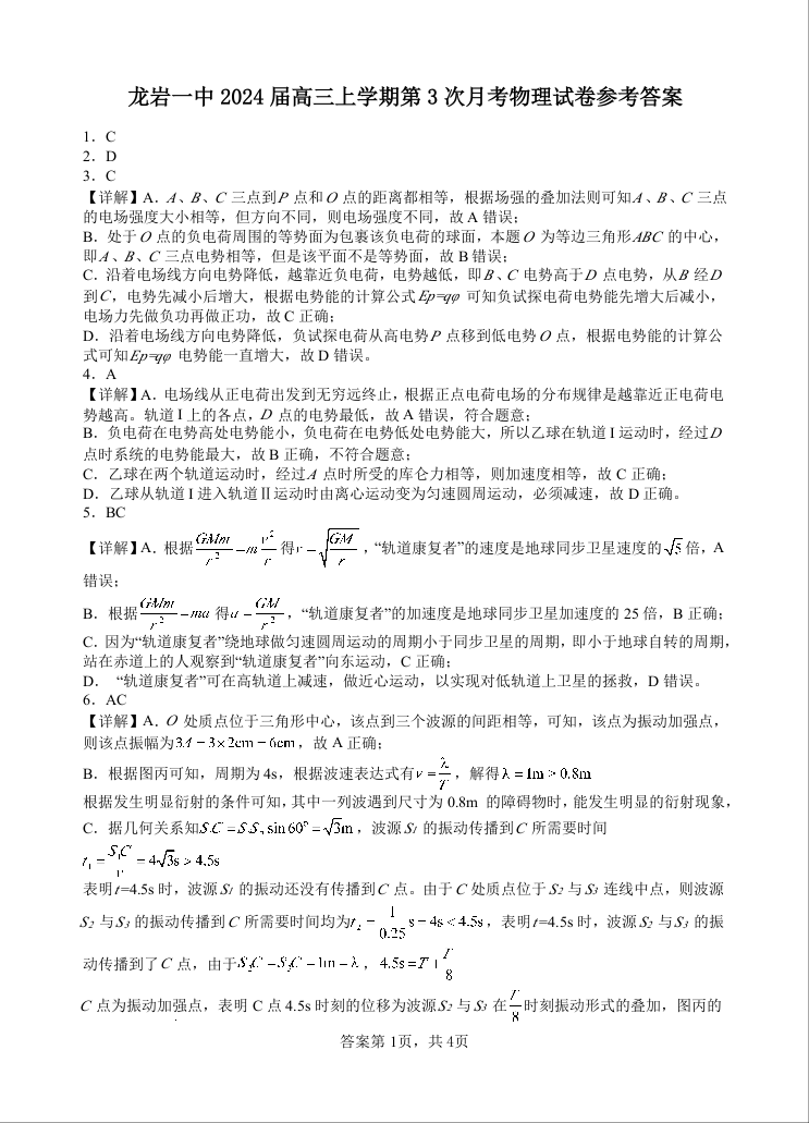 福建省龙岩第一中学2023-2024学年高三上学期第三次月考 物理答案