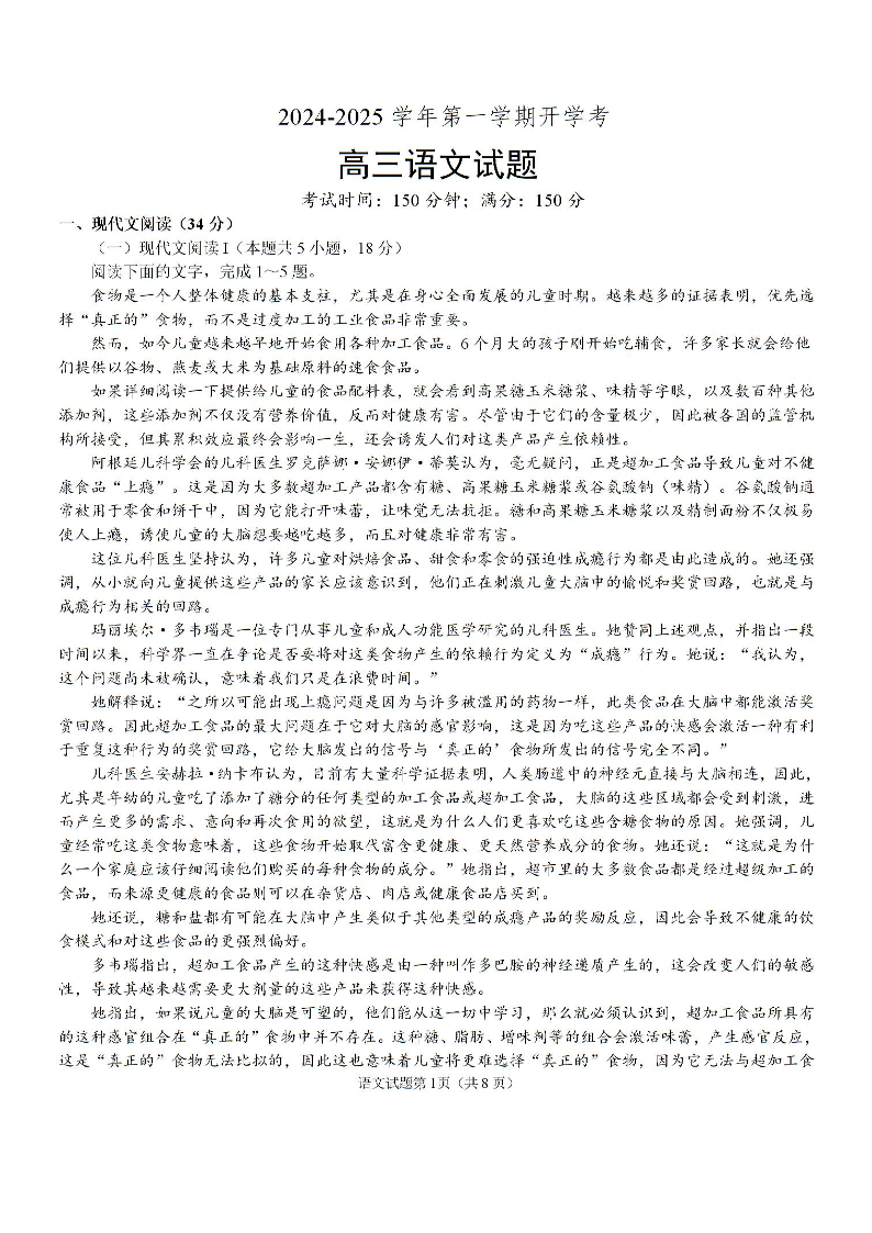 福建省龙岩市龙岩一中2025届高三上学期开学考试+语文