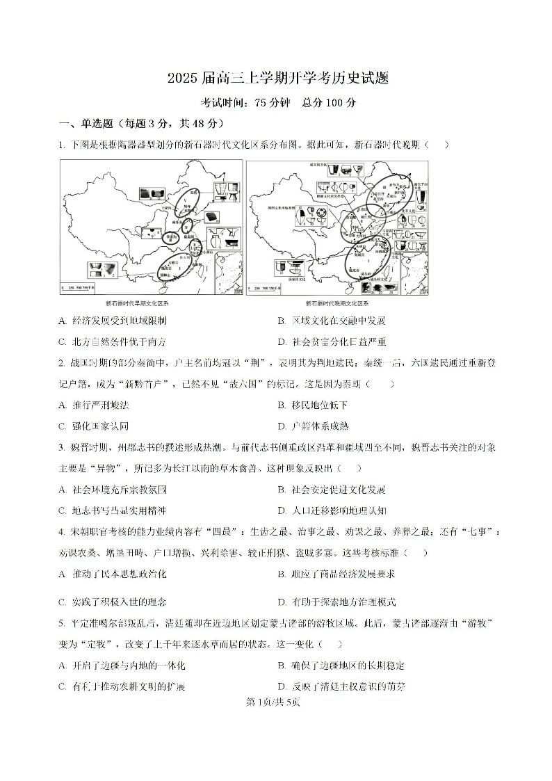 福建省龙岩市龙岩一中2025届高三上学期开学考试+历史