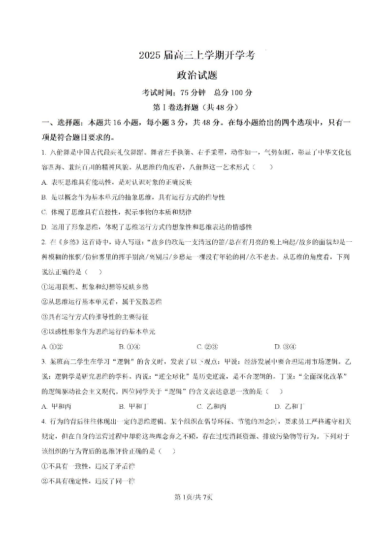 福建省龙岩市龙岩一中2025届高三上学期开学考试+政治
