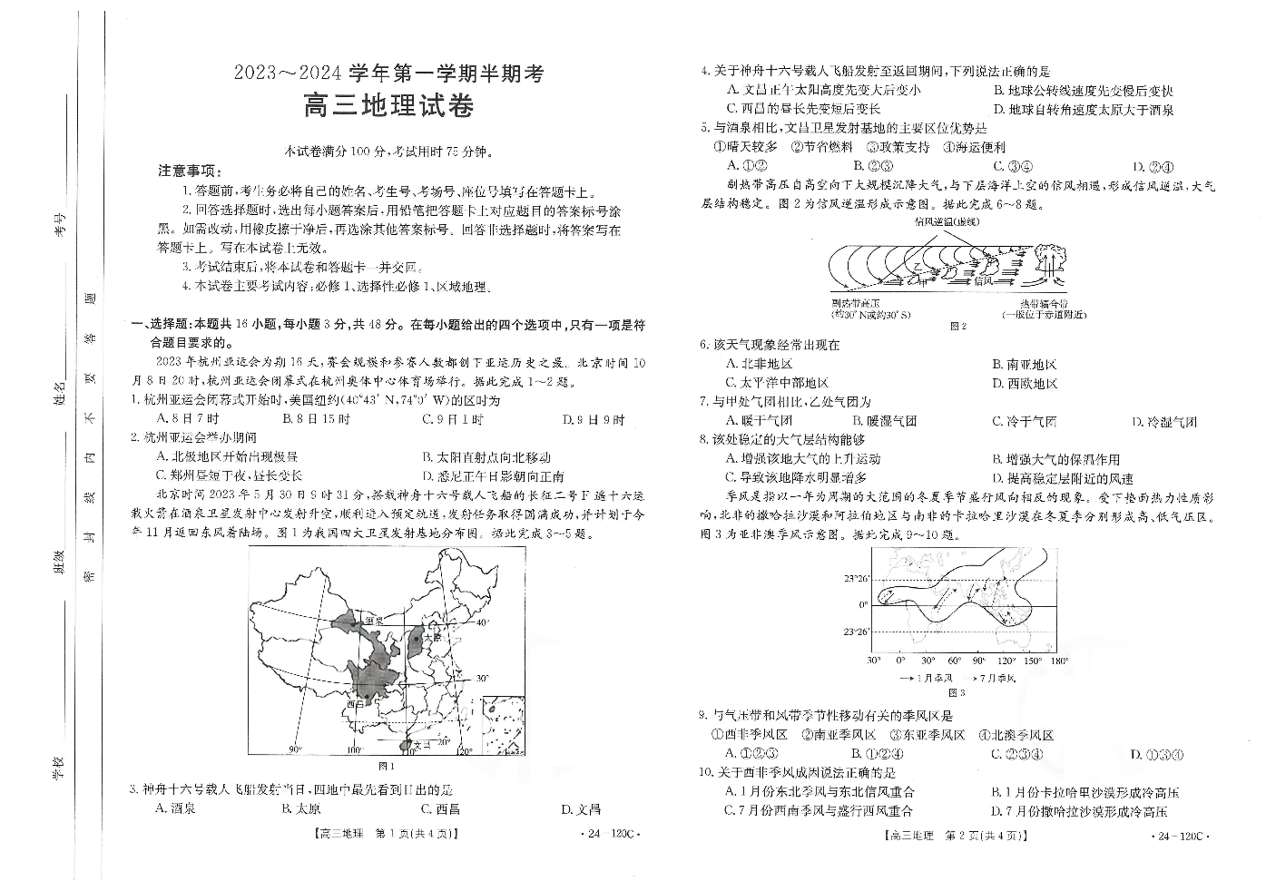 福建省龙岩市名校2023-2024学年高三上学期期中考试 地理