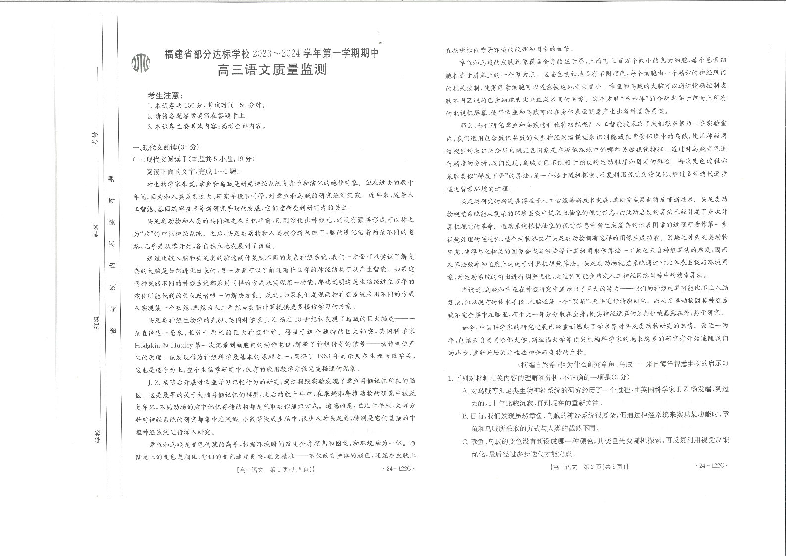 福建省宁德市部分达标学校2023-2024学年高三上学期期中质量检测 语文
