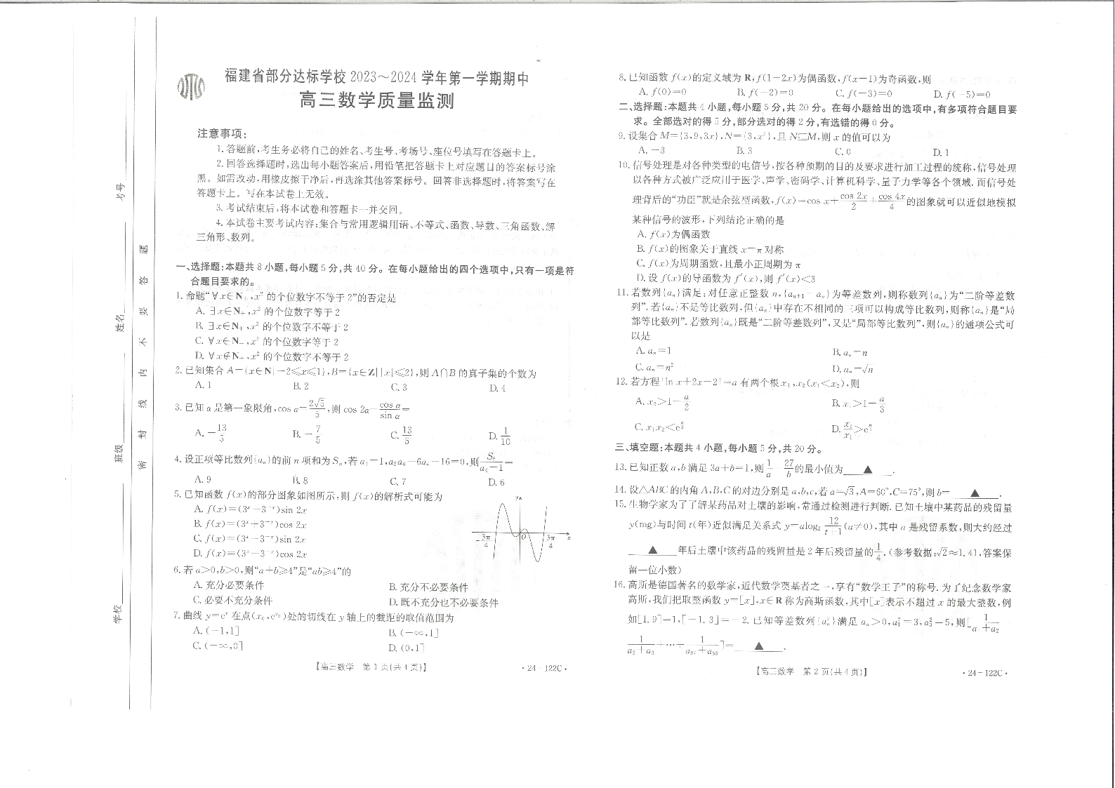 福建省宁德市部分达标学校2023-2024学年高三上学期期中质量检测 数学