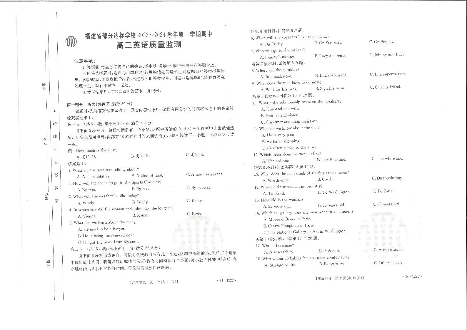 福建省宁德市部分达标学校2023-2024学年高三上学期期中质量检测 英语