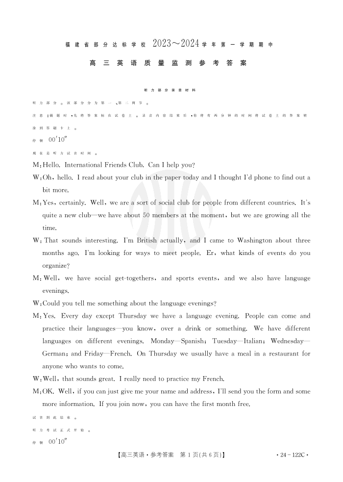 福建省宁德市部分达标学校2023-2024学年高三上学期期中质量检测 英语答案