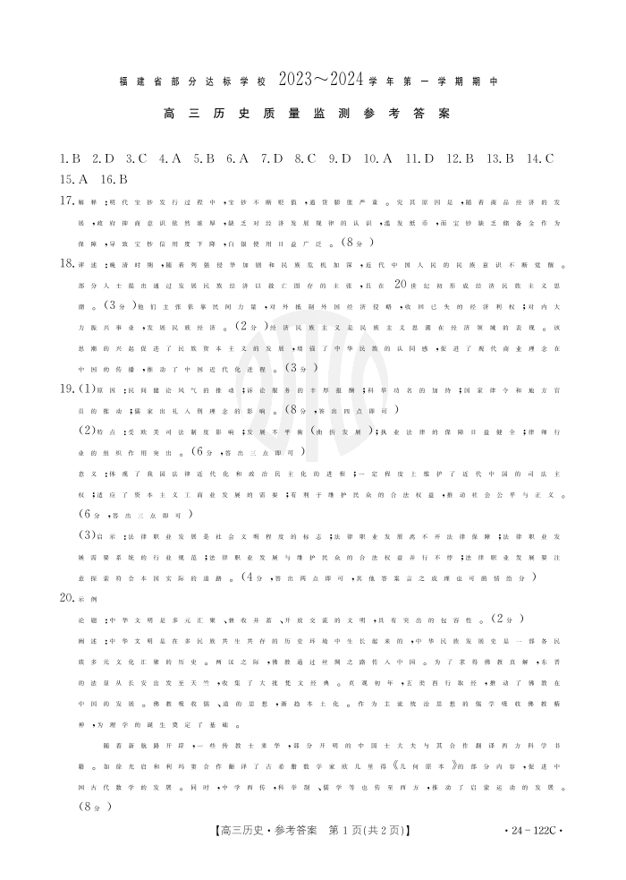 福建省宁德市部分达标学校2023-2024学年高三上学期期中质量检测 历史答案