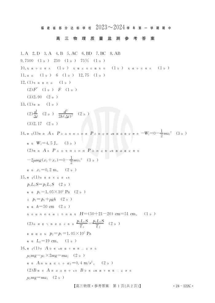 福建省宁德市部分达标学校2023-2024学年高三上学期期中质量检测 物理答案