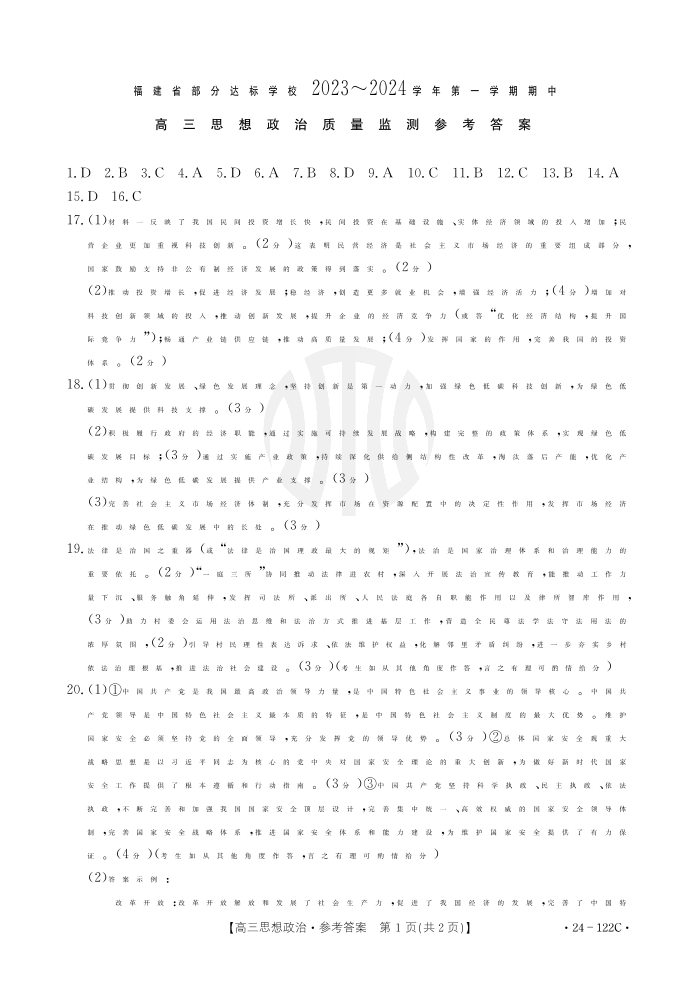 福建省宁德市部分达标学校2023-2024学年高三上学期期中质量检测 政治答案