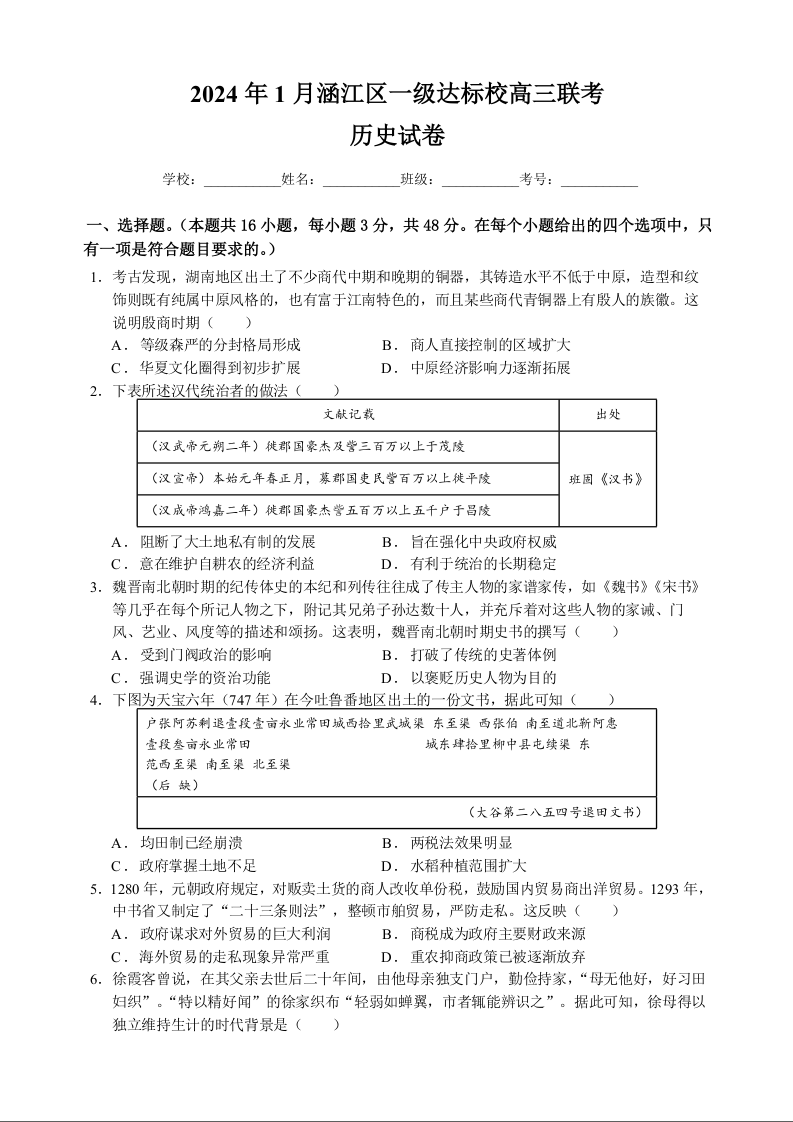 福建省莆田第六中学2023-2024学年高三上学期1月质检模拟测试+历史+Word版含解析