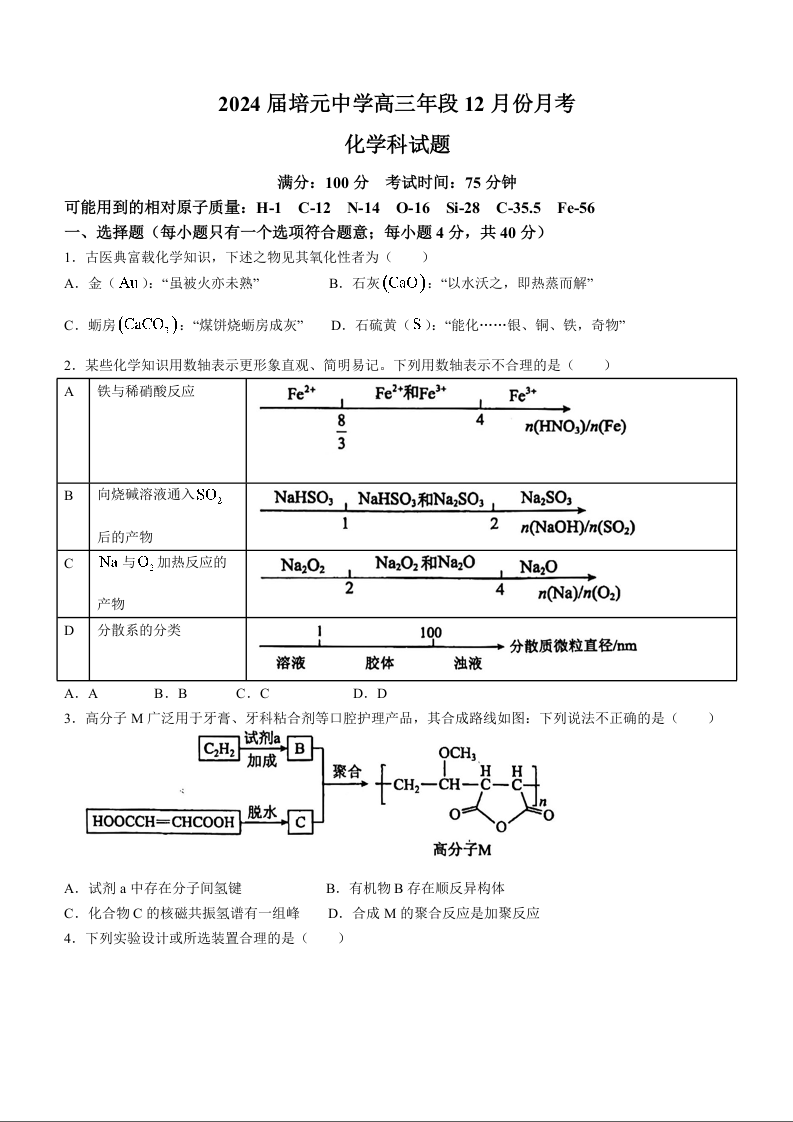 福建省泉州市培元中学2023-2024学年高三上学期12月月考试题 化学