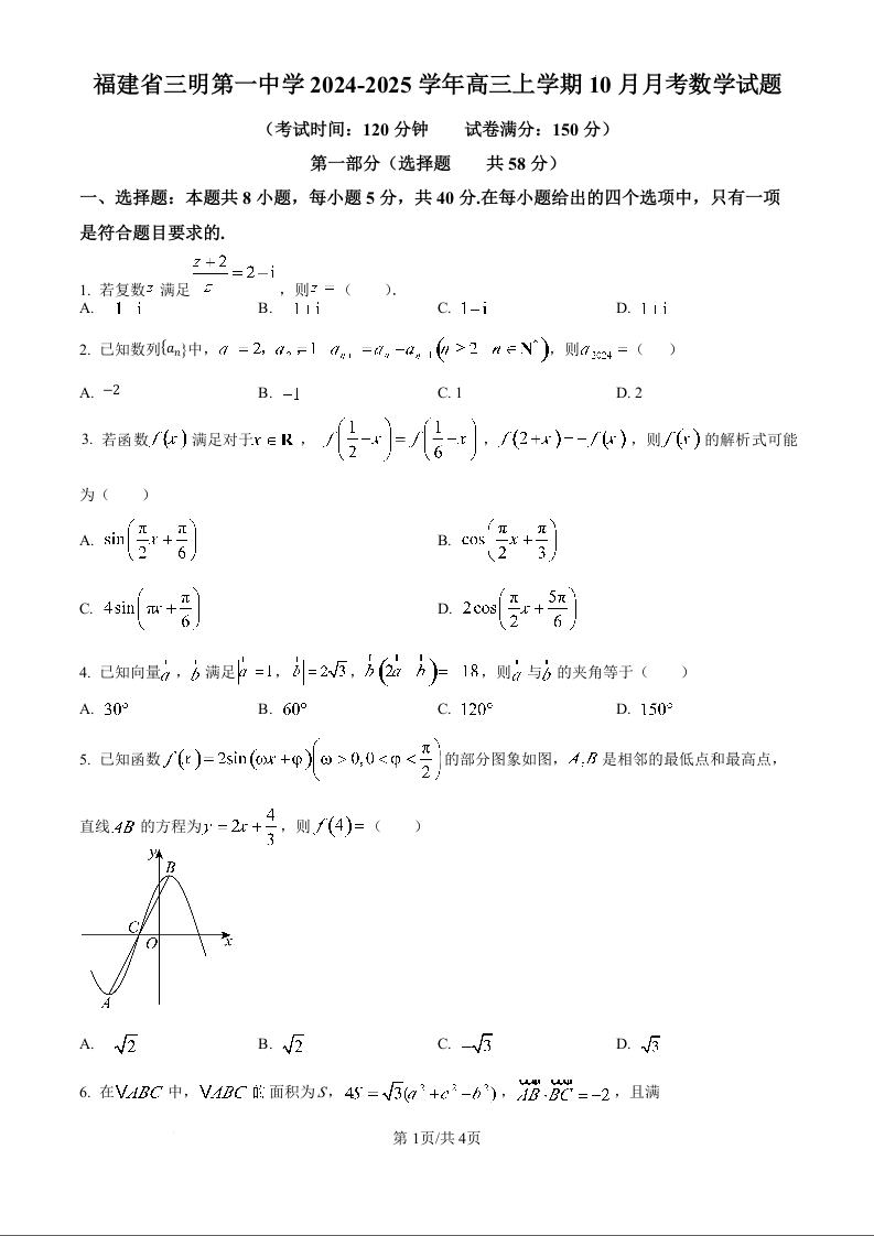 福建省三明第一中学2025届高三上学期10月月考+数学