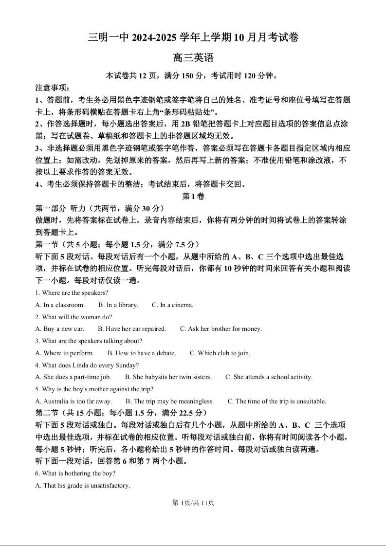 福建省三明第一中学2025届高三上学期10月月考+英语