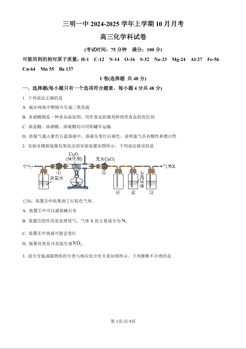 福建省三明第一中学2025届高三上学期10月月考+化学