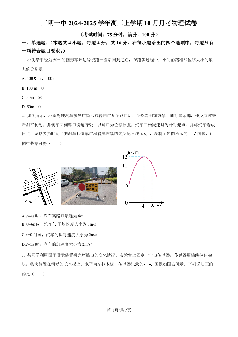 福建省三明第一中学2025届高三上学期10月月考+物理