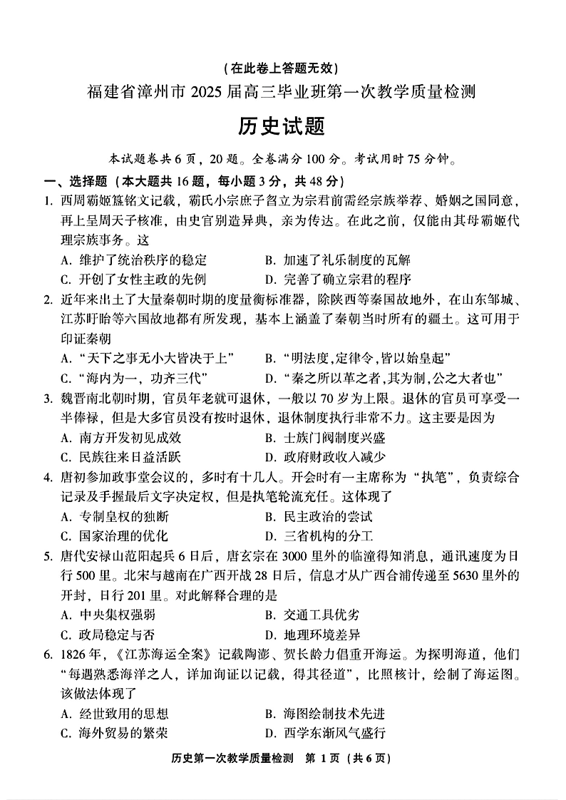 福建省漳州市2025届高中毕业班第一次质量检测+历史
