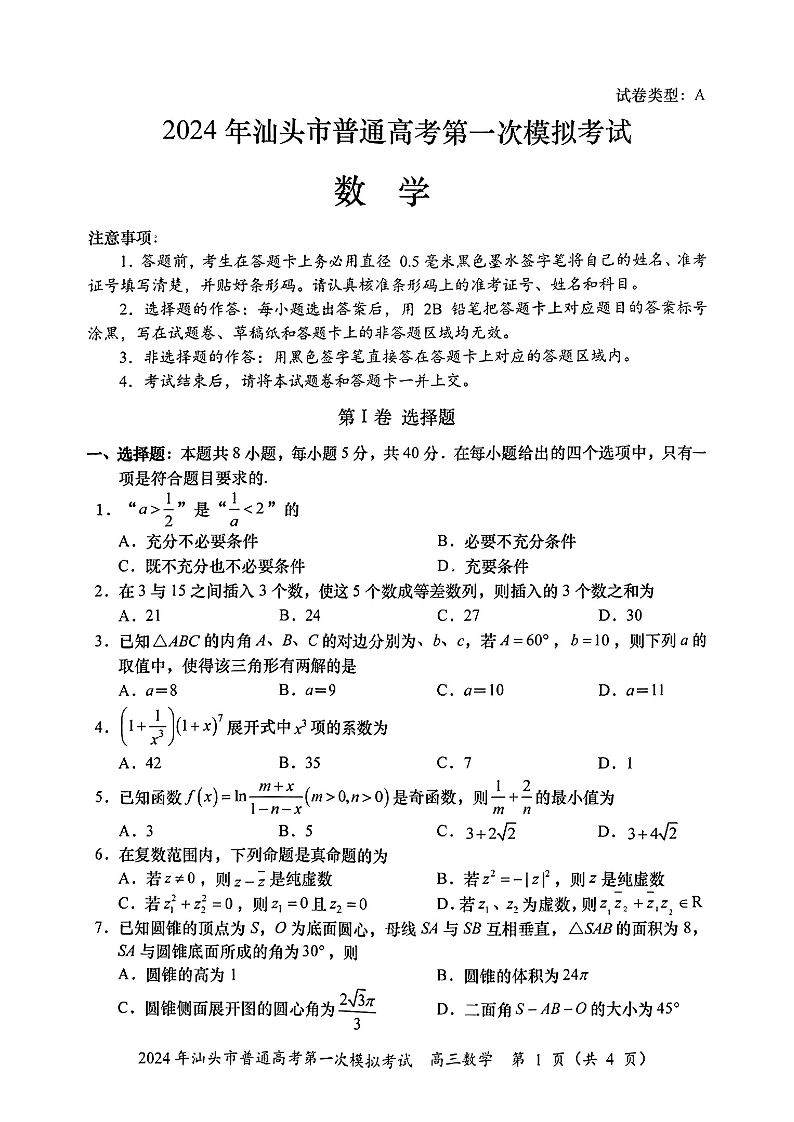 2024届广东省汕头市普通高考第一次模拟考试 数学