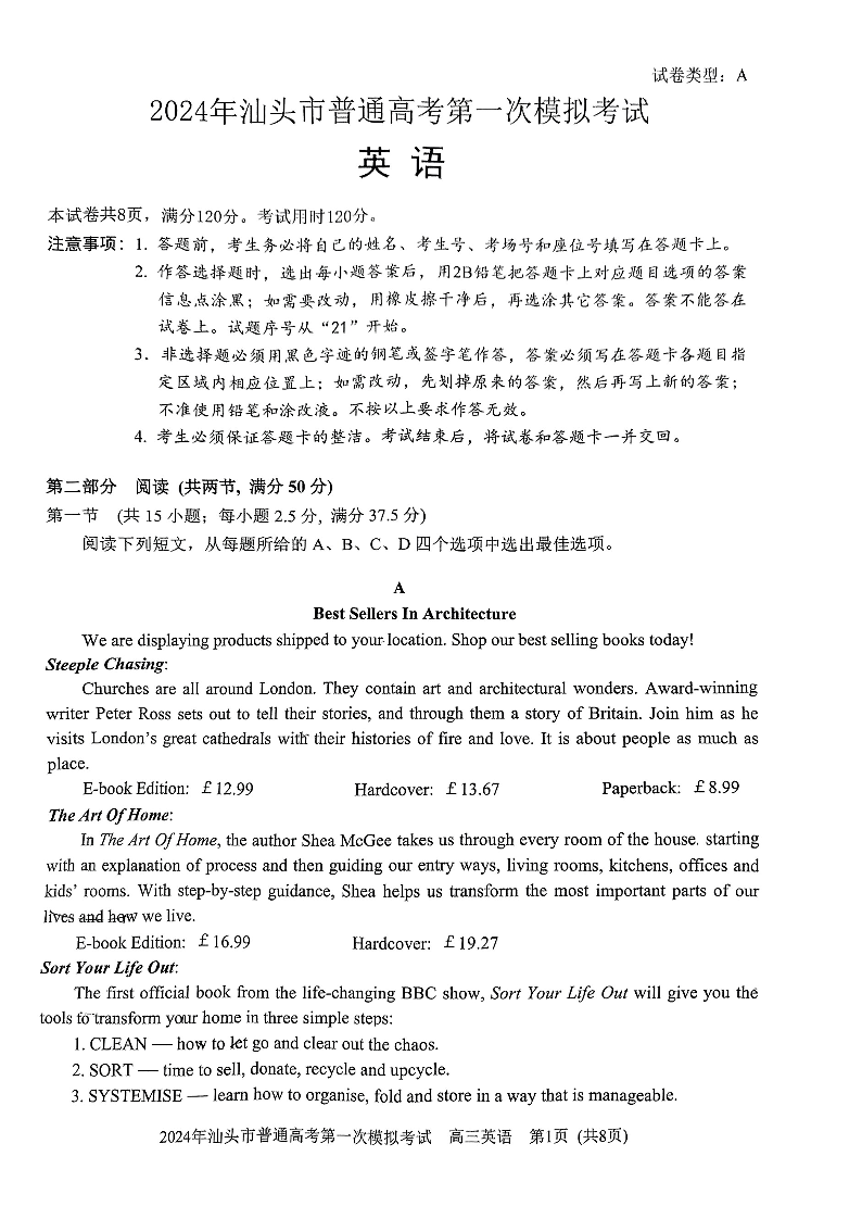 2024届广东省汕头市普通高考第一次模拟考试 英语