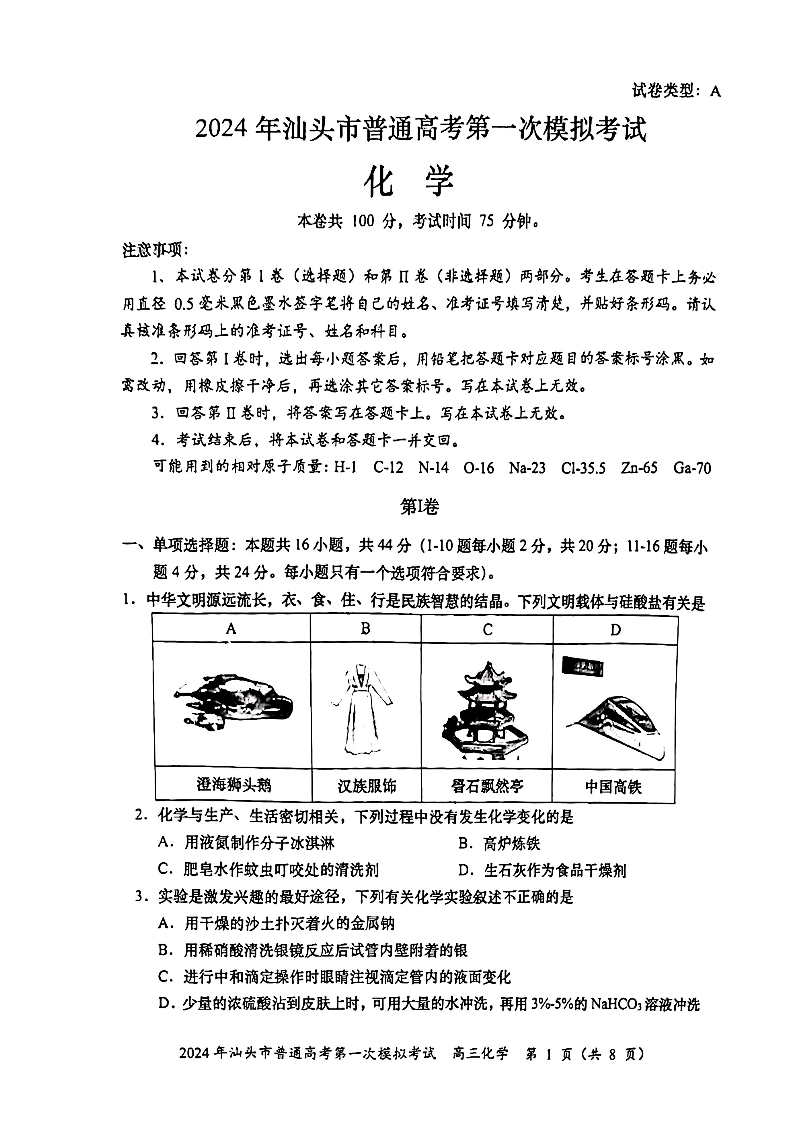 2024届广东省汕头市普通高考第一次模拟考试 化学