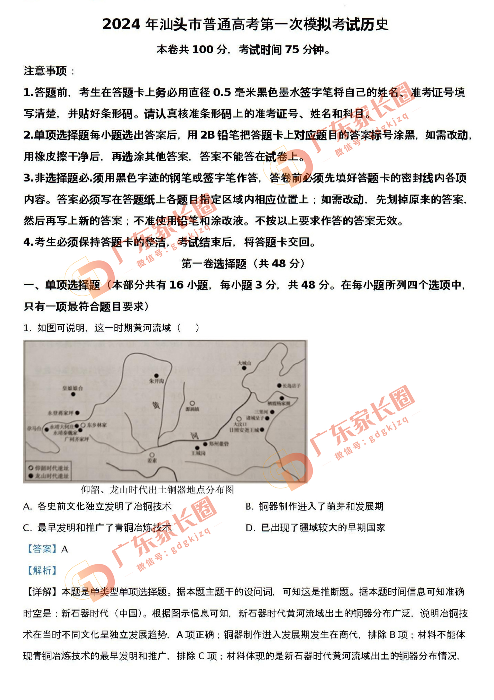 2024届广东省汕头市普通高考第一次模拟考试 历史答案