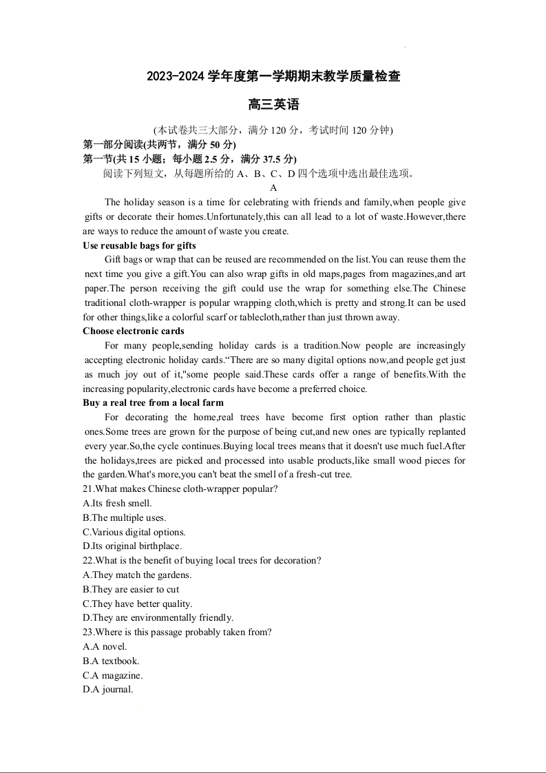 广东省东莞市2023-2024学年高三上学期1月期末教学质量检查 英语