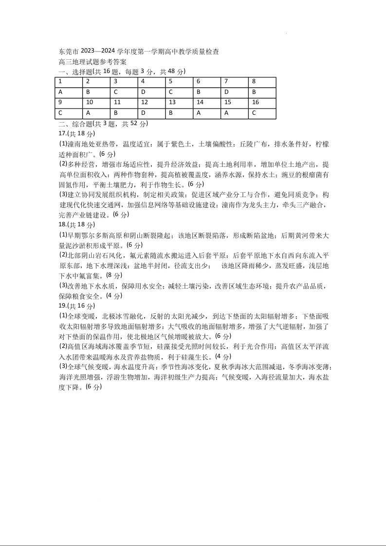 广东省东莞市2023-2024学年高三上学期1月期末教学质量检查 地理答案