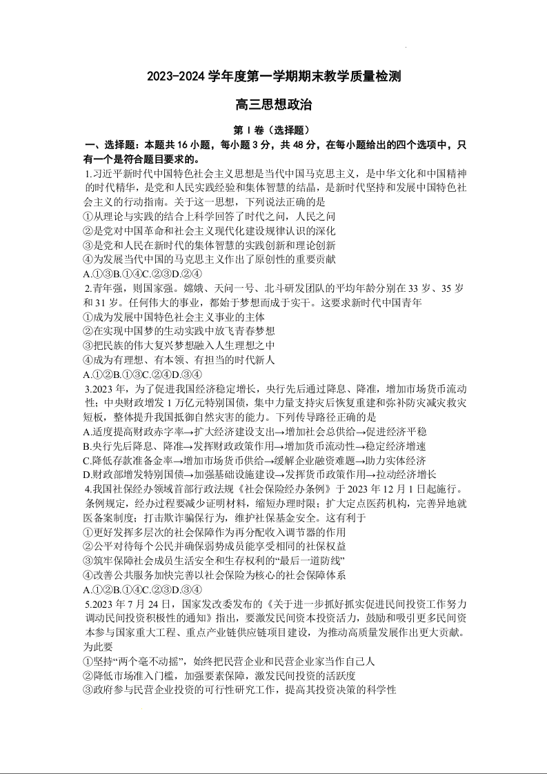 广东省东莞市2023-2024学年高三上学期1月期末教学质量检查 政治