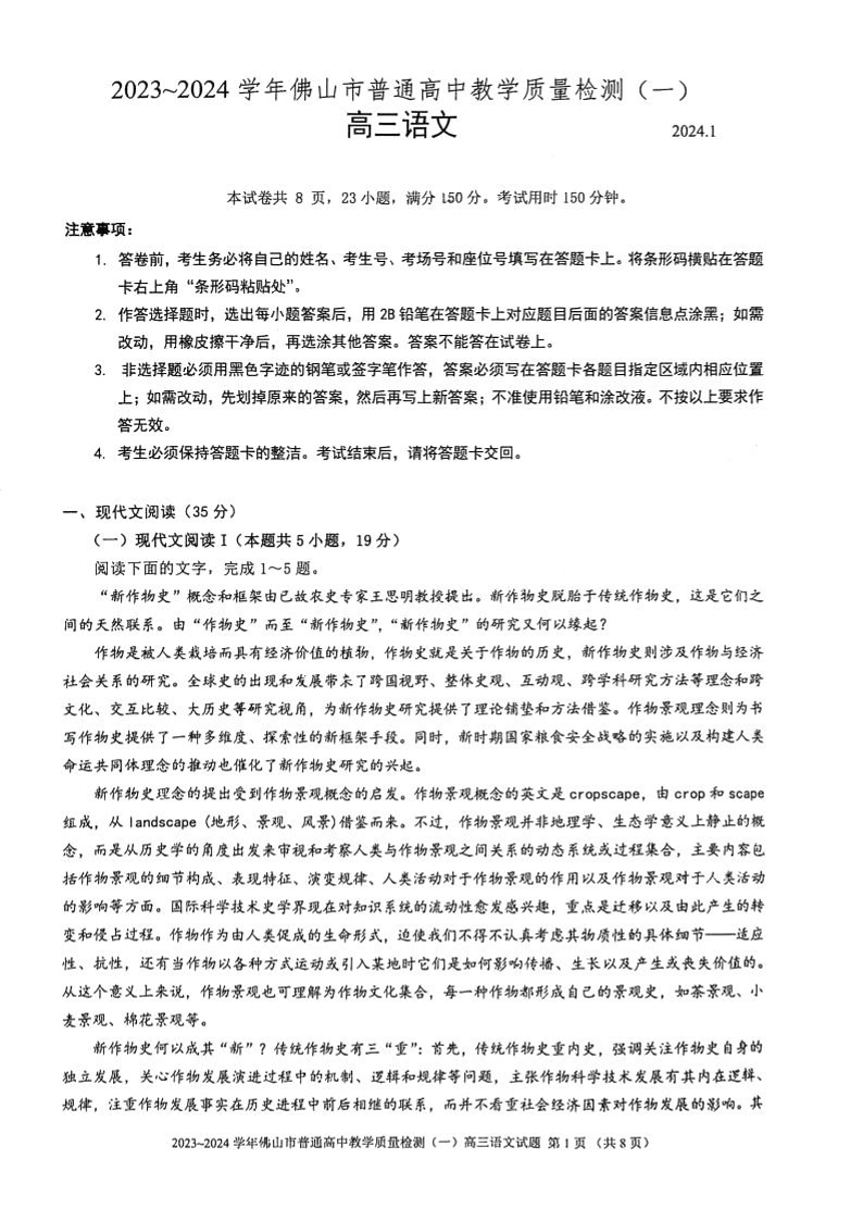 2024届广东省佛山市高三上学期普通高中教学质量检测(一)语文
