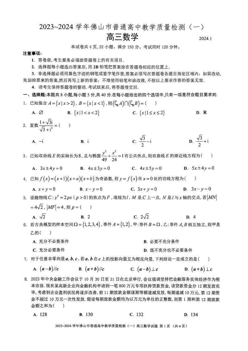 2024届广东省佛山市高三上学期普通高中教学质量检测(一)数学