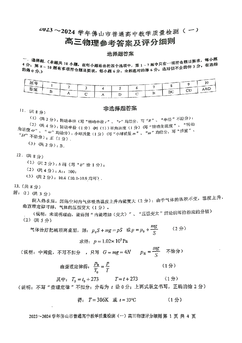 2024届广东省佛山市高三上学期普通高中教学质量检测(一)物理答案
