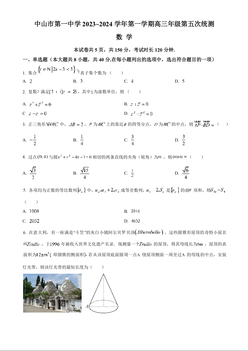 广东省中山市第一中学2023-2024学年高三上学期第五次统测试题 数学