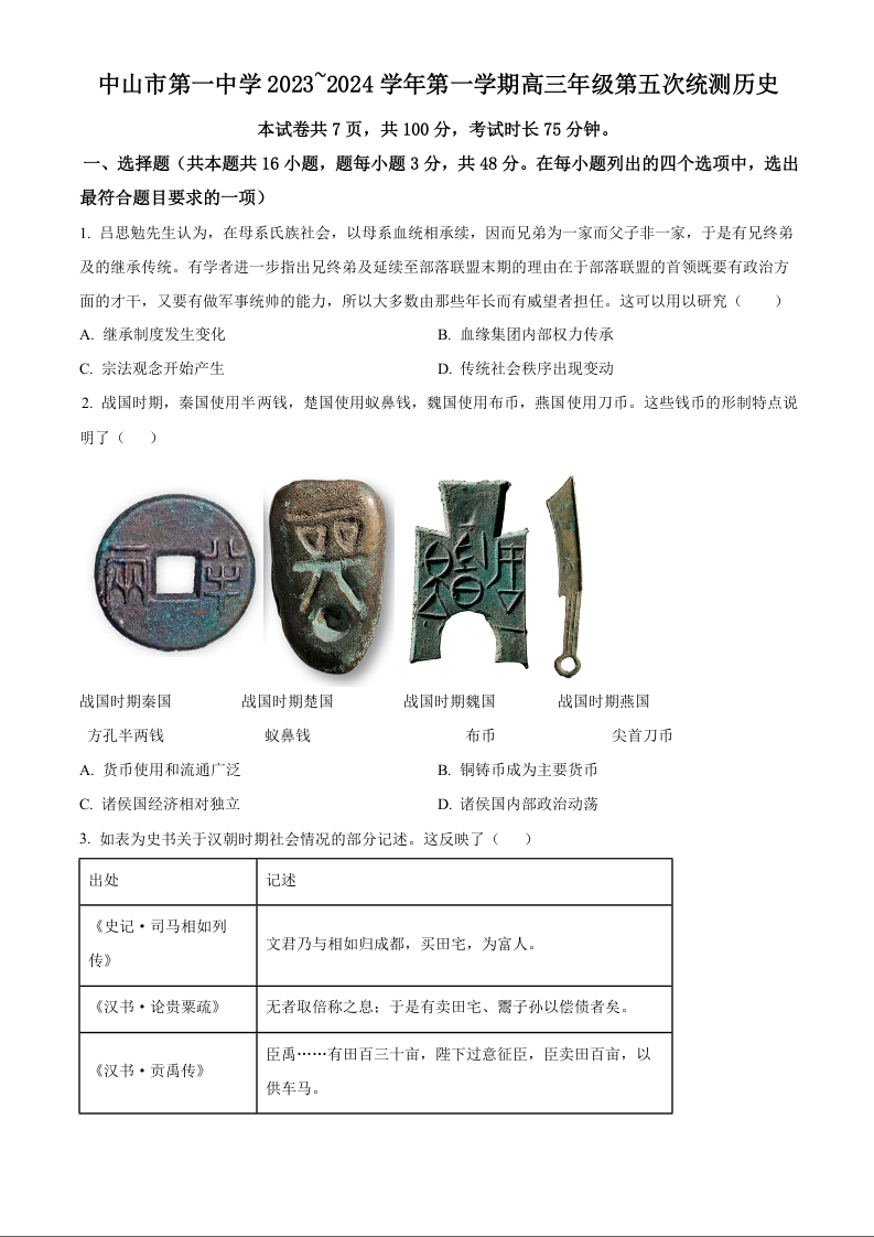 广东省中山市第一中学2023-2024学年高三上学期第五次统测试题 历史