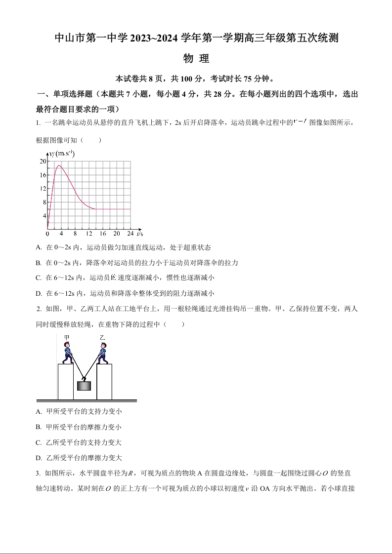 广东省中山市第一中学2023-2024学年高三上学期第五次统测试题 物理