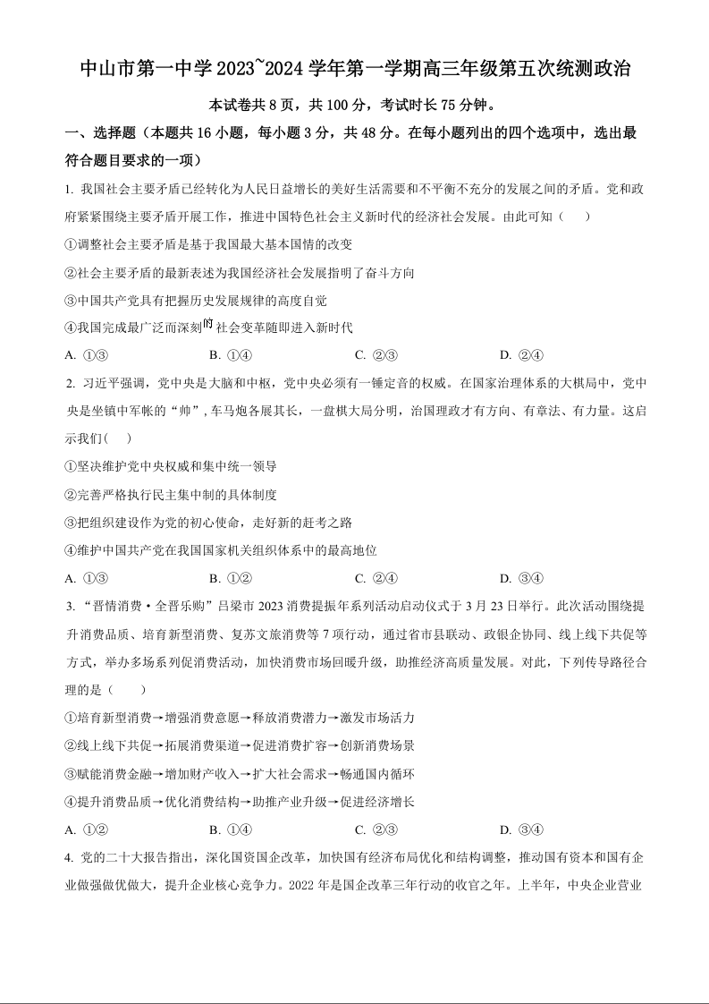 广东省中山市第一中学2023-2024学年高三上学期第五次统测试题 政治