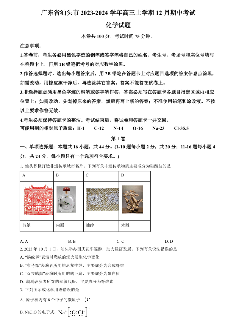 广东省汕头市2023-2024学年高三上学期12月期中考试 化学