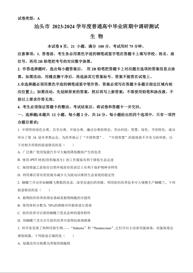 广东省汕头市2023-2024学年高三上学期12月期中考试 生物