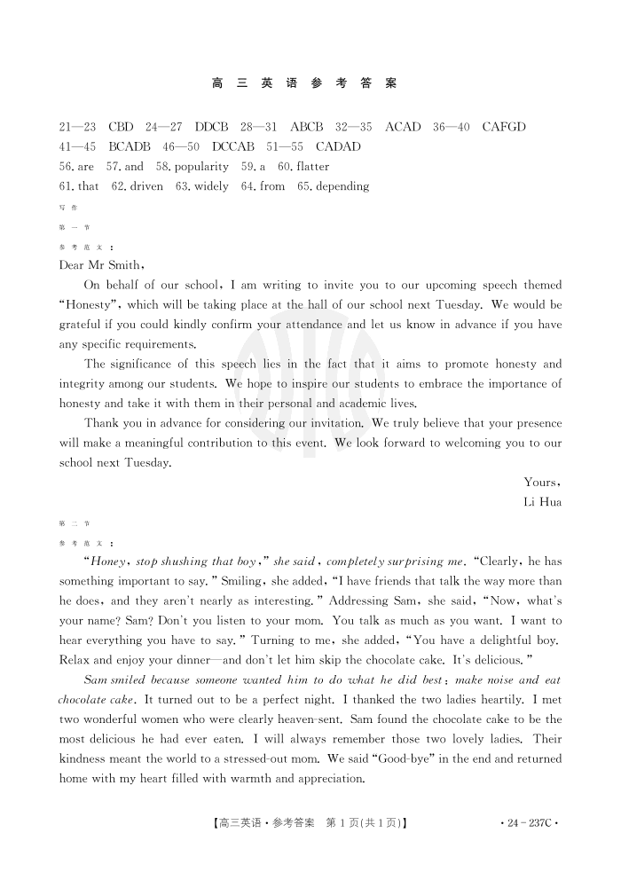 广东省部分名校2023-2024学年高三上学期12月联合质量检测 英语答案