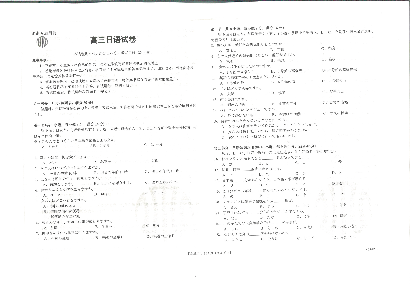 广东省部分名校2023-2024学年高三上学期12月联合质量检测 日语