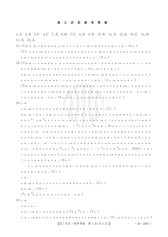 广东省部分名校2023-2024学年高三上学期12月联合质量检测 历史答案