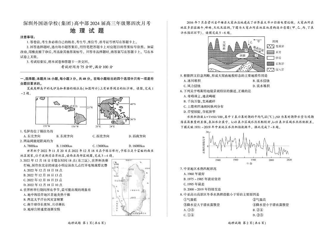 深圳外国语学校高中部2024届高三年级第四次月考 地理