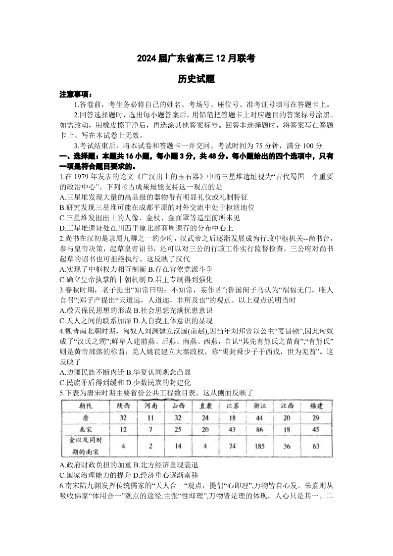 深圳外国语学校高中部2024届高三年级第四次月考 历史