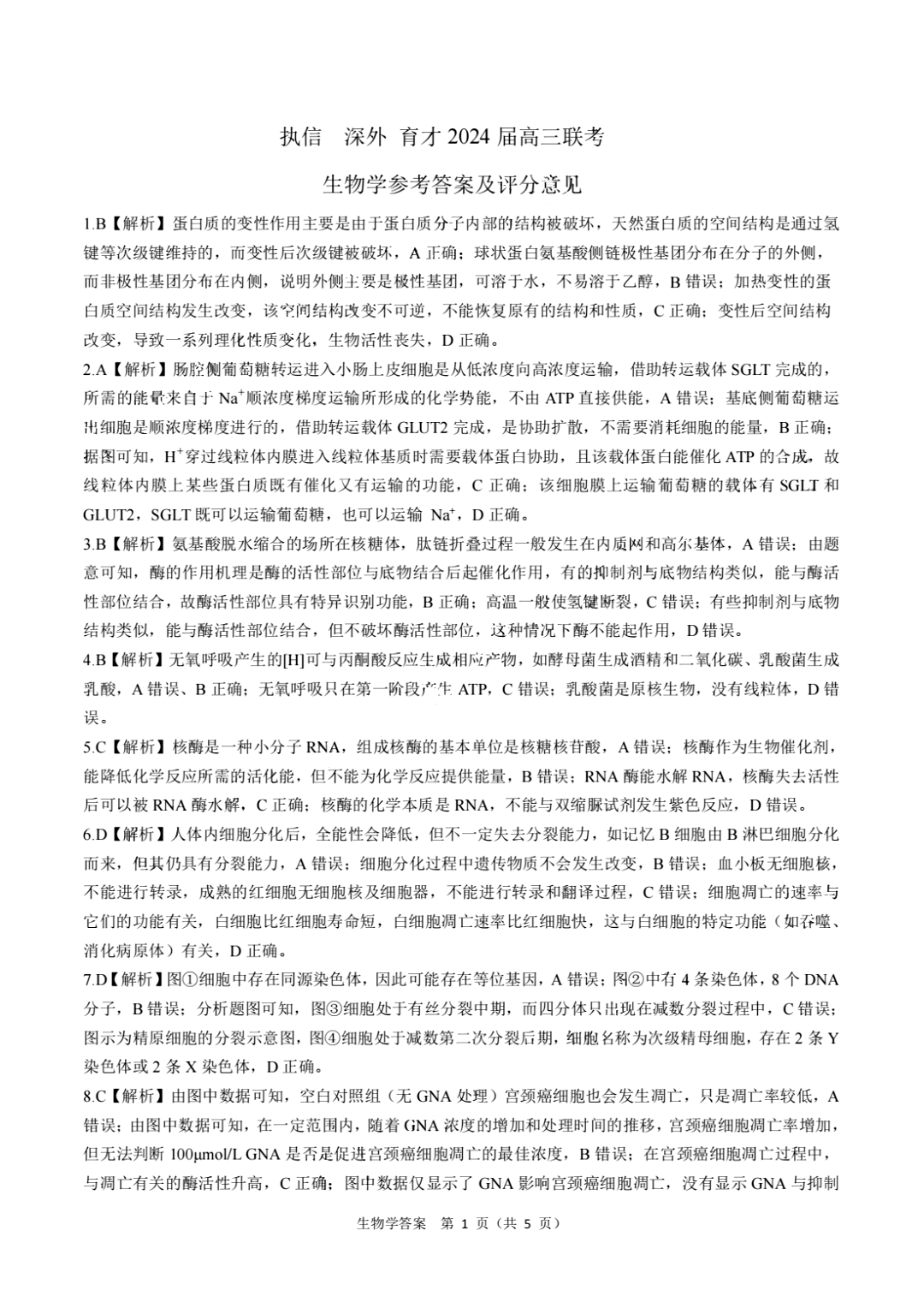 深圳外国语学校高中部2024届高三年级第四次月考 生物答案