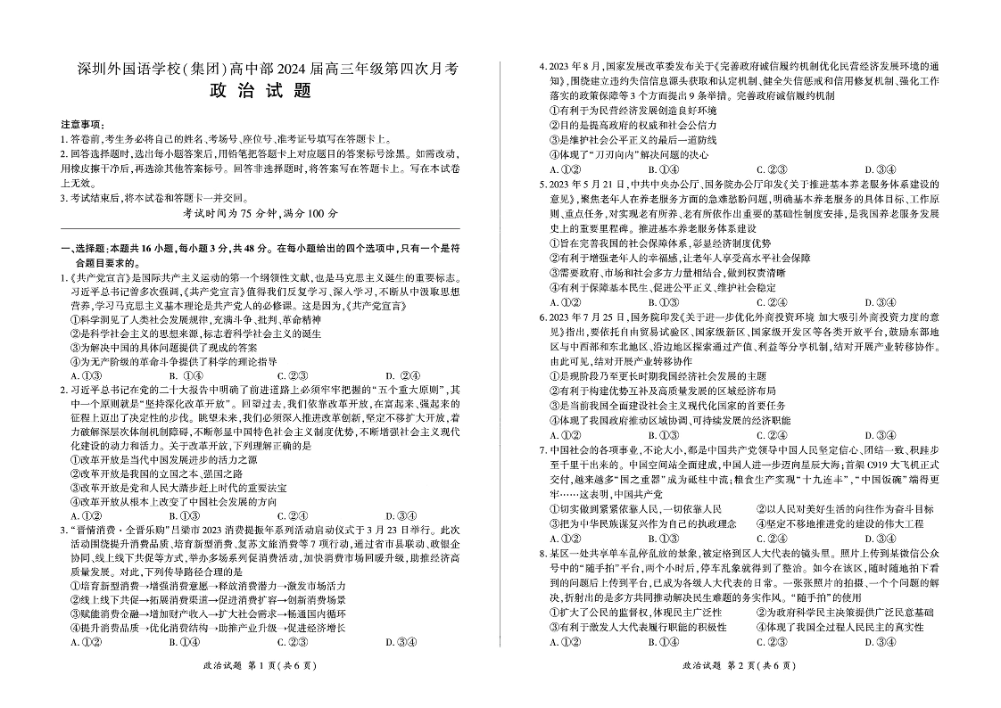 深圳外国语学校高中部2024届高三年级第四次月考 政治