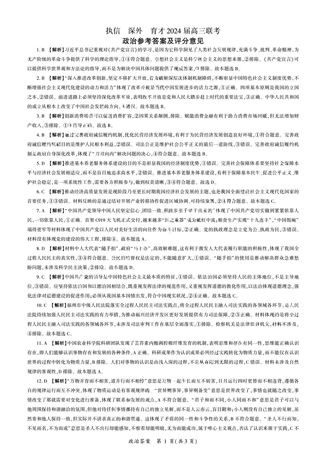 深圳外国语学校高中部2024届高三年级第四次月考 政治答案